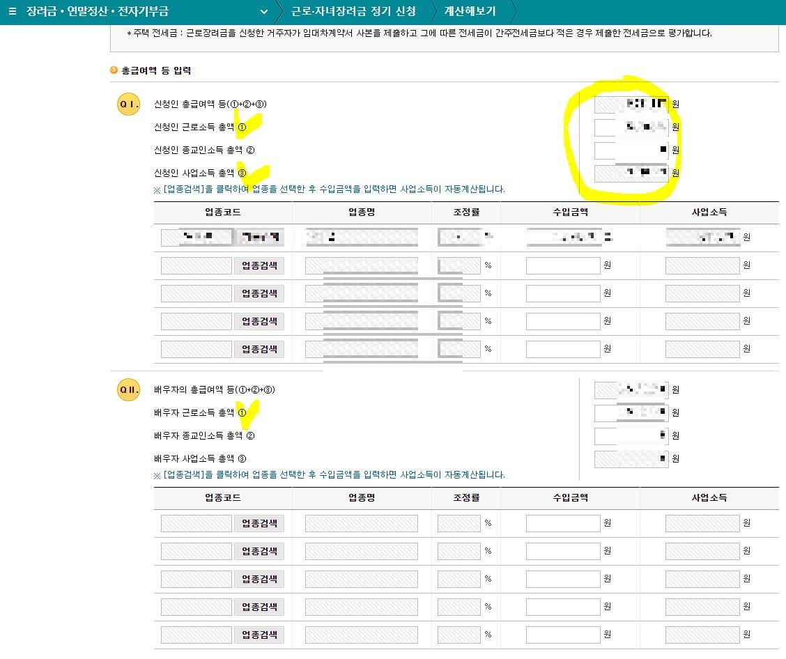 다음은 신청인 근로소득 총액과 배우자 근로소득 총액 등 빈칸에 2022년 최종 소득을 기재합니다.