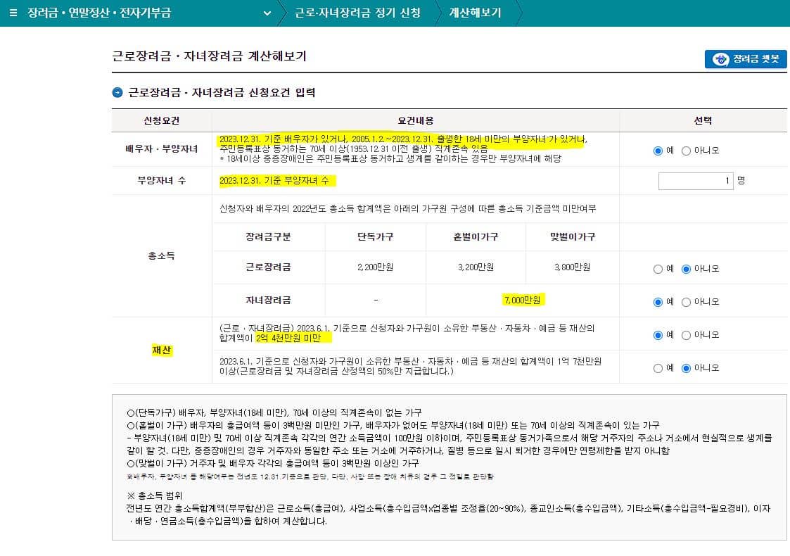 해당 페이지에는 근로 장려금과 자녀장려금을 계산해볼 수 있도록 그에 맞는 신청요건을 다시한번 정리해주고 있습니다.