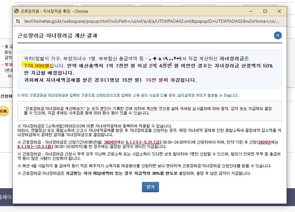 자, 소득 입력 후 하단에 "확인" 버튼을 누르시면 아래와 같이 근로장려금과 자녀장려금 계산 결과를 조회해보실 수 있습니다.