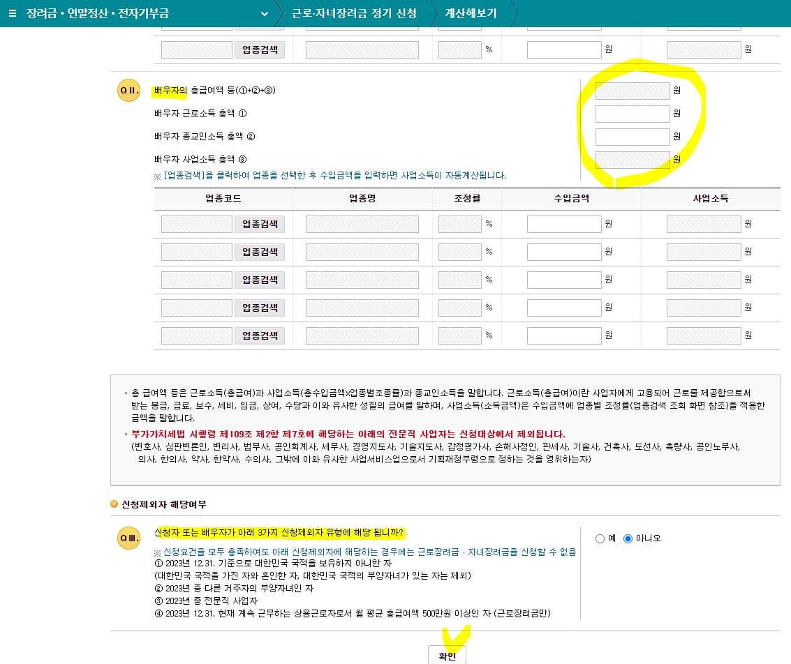 신청인 근로소득 총액과 배우자 근로소득 총액을 정확하게 기재 후 신청제외자에 해당되는지 한번더 아래 글을 읽어보시고 확인 체크를 해줍니다.